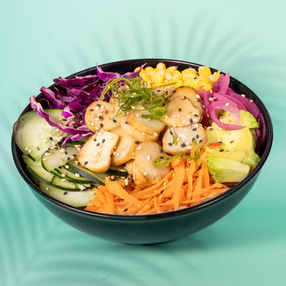 Hongos, aguacate, pepino, cebolla curtida, cebollín, ajonjolí, repollo, maíz y zanahoria.